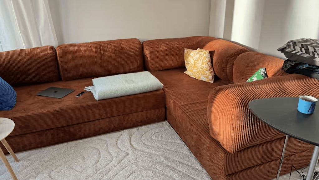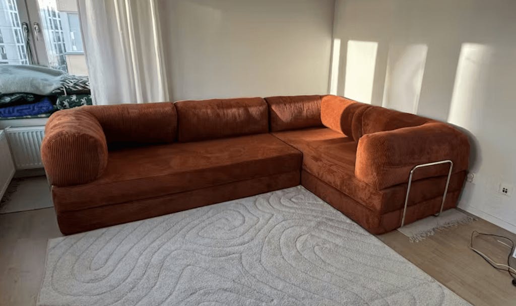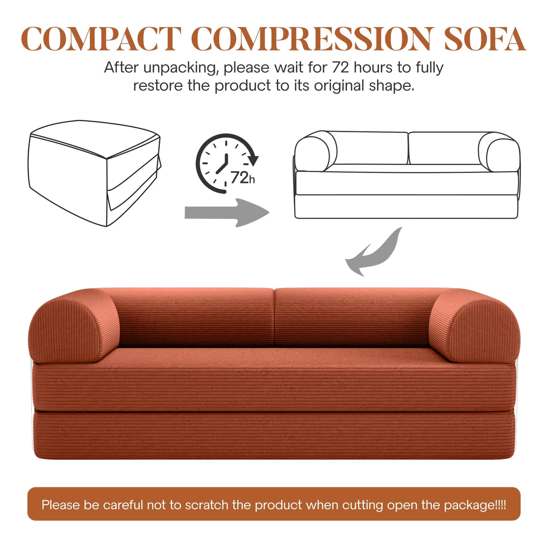 The sofa bed arrives vacuum-packed for easy delivery. Simply unbox, let the cushions expand for 24–72 hours, and perform the simple assembly to set it up.