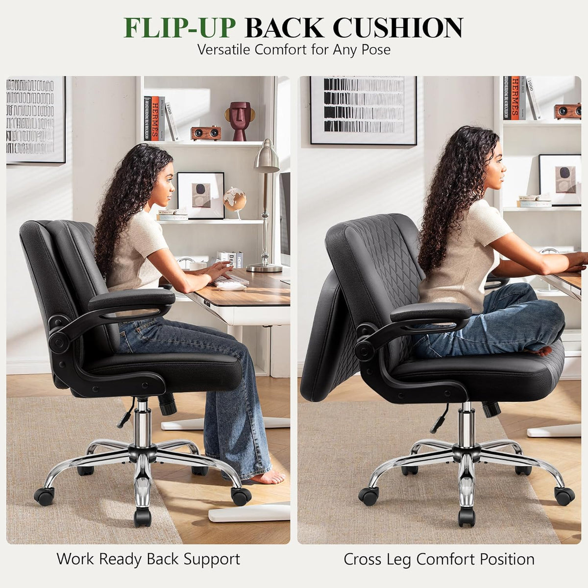 Criss Cross Office Chair with 2-in-1 Flip Backrest – Ergonomic PU Leather Floor Sitting Chair, Adjustable Height, 360° Swivel & Flip-Up Arms, Extra-Wide Seat for Home Office, Vanity, Nail Salon
